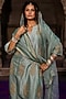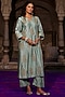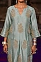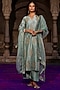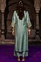 Featuring a sage green kurta in raw silk base with dori work. It is paired with palazzo pants and an organza dupatta having lurex patch and kiran detailing. Style this designer set with wedges, gold jhumkas and a sleek braid for a chic ethnic look. Ideal for festive gatherings or mehendi ceremonies.