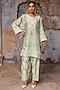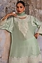 Featuring a tea green kurta in slub raw silk base with dori work. It is paired with palazzo and an organza dupatta. Style it with kundan jewellery and classic heels for a regal, polished look. Perfect for pre-wedding functions, festive celebrations or pooja ceremonies.