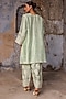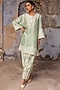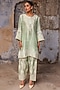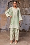 Featuring a tea green kurta in slub raw silk base with dori work. It is paired with farshi pants. Style it with kundan jewellery and classic heels for a regal, polished look. Perfect for family gatherings, festive celebrations or pooja ceremonies.