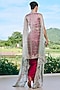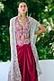 Featuring an aqua blue cape in tissue base with embroidery. It is paired with an embroidered fuchsia waistcoat and pick-up skirt. Accentuate it with statement earrings and heels for a festive look.