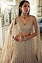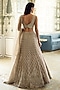 Charu & Vasundhara presents a golden lehenga in tissue base with jaal embroidery. It is paired with an embellished blouse and a dupatta. Accentuate it with zircon earrings. a clutch and block heels for a stylish ensemble, ideal for a wedding or engagement ceremony.