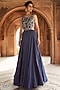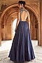Featuring a medieval blue gown in tussar base with a diamond cut-out back and pyramid hand embroidery.