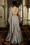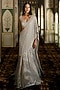 Charu & Vasundhara presents a silver draped saree in tissue base with hanging embroidery. It is paired with an embroidered blouse. Accentuate it with statement earrings. a clutch and block heels for a stylish ensemble, ideal for festive gathering, sangeet or reception ceremonies.