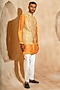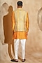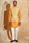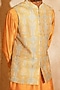 Featuring a mustard nehru jacket in cotton silk base with embroidery. It is paired with a kurta and pants. Style it with classic loafers and a watch for a refined traditional look, Perfect wear for festive gatherings or haldi ceremonies.