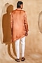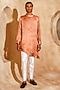 Featuring a peach angrakha style kurta in modal satin base with pintucks detail. It is paired with pants. Style it with classic loafers and a watch for a refined traditional look, Perfect wear for festive gatherings or sangeet nights.