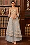 Featuring a blue and ivory lehenga in tulle and lace base with threadwork, pearls and crystals embellishments. It is paired with a nude net corset blouse and a tiered embroidered dupatta. Accentuate it with statement jewellery and sleek heels for a refined look, perfect for grand festive parties, receptions and sangeet ceremonies.