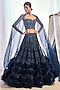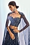 Featuring a french navy blue ruffled lehenga in tulle base with sequins, crystal and thread work. It is paired with a corset blouse having crystal detail and a shoulder drape. Accentuate it with kundan polki or meenakari jewellery, embellished heels and a potli bag for an elegant look, perfect for weddings, sangeet ceremony or a diwali soirees.