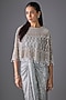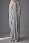 Featuring a grey cape in tulle and sequins base with crystal embroidery. It is paired with a bustier and a draped sequin skirt. Accentuate it with stud earrings, wavy curls and heels for sangeet ceremony or cocktail party.