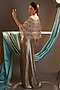 Featuring a metallic nude cape in tulle and lame base with pearl crystal and thread work embroidery. It is paired with a bustier and a metallic liquid satin draped skirt. Accentuate it with statement earrings and sleek heels for a contemporary glam look, Perfect for cocktail parties, sangeet nights and festive soirees.