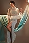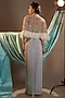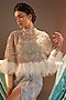 Featuring a nude cape in tulle base with crystal embroidery and feather detailing. It is paired with a bustier and an iridescent blue sequins draped skirt. Accentuate it with statement earrings and sleek heels for a contemporary glam look, Perfect for cocktail parties, sangeet nights and festive soirees.