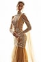 Featuring a nude tiered draped saree in tulle base with floral aari, pearls, crystal and beadwork. It is paired with a blouse having pearl, bugle beads and crystal embroidery. Accentuate it with statement chandelier earrings and metallic heels for a regal look, perfect for weddings, receptions and festive celebrations.