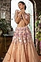 Featuring a peach pink lehenga in tulle base with 3D floral embellishments. It is paired with an embellished corset and a capelet blouse. Accentuate it with statement jewellery and embellished heels for a striking contrast look, perfect for weddings, festive celebrations and grand receptions.