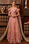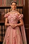 Featuring a pink lehenga in tulle base with sequins floral motifs and crystal beadwork embroidery. It is paired with an off-shoulder ruffled blouse, including a pink and green shaded dupatta. Accentuate it with delicate diamond jewellery and embellished heels for a modern princess vibes, perfect for sangeet nights, receptions and festive celebrations.