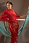 Featuring a red cape in tulle base with crystal embroidery and scalloped detailing. It is paired with a bustier and a sequins skirt. Accentuate it with statement earrings and sleek heels for a contemporary glam look, Perfect for cocktail parties, sangeet nights and festive soirees.