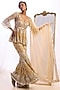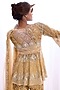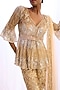Featuring a silver and gold peplum top in tulle base with a V-neck. It is paired with sharara pants having geometric artwork, a net dupatta and a belt. Style it with statement jewellery and heels for festive occasions, cocktail or wedding ceremonies.