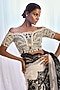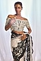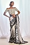 Featuring a white saree in tulle base with black thread embroidery. It is paired with an off-shoulder blouse, a pallu and an underskirt. Accentuate it with diamond earrings, wedges and a potli bag for an elegant look, perfect for sangeet ceremony or diwali soirees.