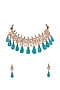 Featuring a gold finish necklace studded with blue kundan polki, set in mixed metal. It is paired with a matching pair of earrings.