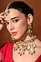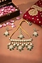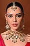 Featuring a gold finish choker necklace studded with green kundan polki, set in mixed metal. It is paired with a matching pair of earrings and a maangtikka. Add a touch of sparkle to your ensemble, perfect for festive occasions, evening soirees or cocktail parties.