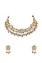 Featuring a gold finish necklace studded with green kundan polki, set in mixed metal. It is paired with a matching pair of earrings.