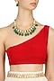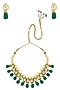 Featuring a gold finish necklace studded with kundan stones and emerald stone drops strung in pearls, set in mixed metal alloy. It comes along with pair of gold finish earrings studded with kundan stone and emerald stone drop.