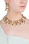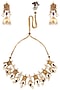 Featuring a gold finish textured necklace with indian motif, white and blue stone and mother of pearls. It comes along with a matching pair of earrings, set in alloy metal.