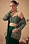 Featuring a green jacket in crepe base with hand embroidery and print. It is paired with a printed and hand embroidered bustier, including a satin draped skirt. Accentuate it with statement jewellery and block heels for a mehendi or engagement ceremony.