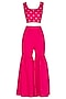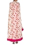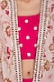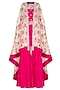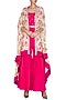 Featuring a pink crop top in crepe and cotton base with sequins and pearl embroidery. It is piared with matching gharara pants and printed cape.