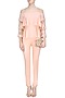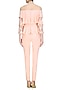 Featuring a pink off shoulder layered top in crepe with zardosi work in sleeves. It comes along with pink pants in cotton lycra and pink base rose gold floral embroidered choker.