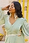 Featuring a sage green pre-draped saree in georgette base. It is paired with a blouse having embroidered balloon sleeves and a belt. Accentuate it with statement jewellery and heels for weddings or festive occasions.