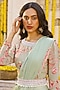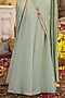 Featuring a sage green blouse in crepe and georgette base with print and an attached drape. It is paired with matching organza palazzo pants and an embroidered belt.