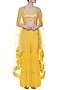 Featuring a yellow blouse in georgette base with zardosi embroidery. It is paired with matching sharara pants and cape in organza base.