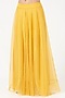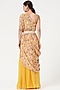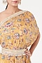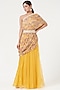 Featuring a yellow one shoulder cowl top in crepe base with hand embroidery and print. It is paired with organza palazzo pants and a silver hand embroidered belt. Accentuate it with statement jewellery and heels for a festive occasion.