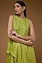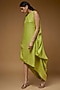 Featuring a green high-low dress in linen base with half uneven folds and shoulder openings. Accessorise with dangler earrings and heels for a complete look.