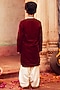 Featuring a maroon kurta for boys in velvet base. It is paired with white pyjama pants. Team it up with mojaris and watch for a festive occasion or pooja ceremony.