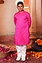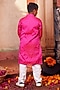 Featuring a pink kurta for boys in banarasi silk base. It is paired with white pyjama pants. Team it up with mojaris and watch for a festive occasion or pooja ceremony.