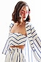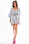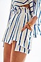 Featuring a blue and white tube top in jacquard base with stripes. It is paired with matching shorts and a shrug.