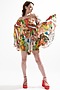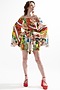 Featuring a multi-colored off-shoulder dress in silk base with bell sleeves and marco polo print.