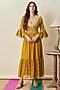 Featuring a mustard yellow cinched maxi dress in cotton base with a V-neckline, lace, and bell sleeves.