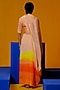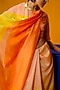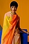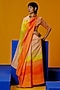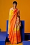 Featuring a bright orange and yellow saree in linen silk base with print. It is paired with a stripe printed blouse. Accentuate it with dangler earrings and heels for family gatherings.