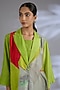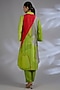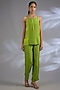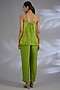 Featuring a green asymmetrical jacket in dupion silk base. It is paired with an inner and straight pants. Style it with statement earrings, soft curls and block heels, perfect for festive gatherings or formal celebrations.