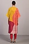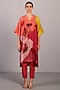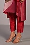 Featuring an orange-red high-low kurta in linen silk base with short sleeves and a v-neck collar. It is paired with straight pants. Accentuate it with hoop earrings and flats for family gatherings.