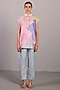 Featuring an orchid pink and powder blue top in linen silk base with short sleeves and a point collar. It is paired with straight pants. Accentuate it with hoop earrings and flats for a brunch date or sundowner.
