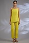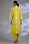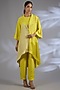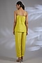 Featuring a yellow asymmetrical jacket in dupion silk base. It is paired with an inner and straight pants. Style it with statement earrings, soft curls and block heels, perfect for festive gatherings or formal celebrations.