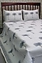 White pure cotton quilted bedspread with blue palm tree hand block print, layered with superior quality cotton, cotton wadding and base cotton. All these three layers are intricately machine quilted together with different kinds of stitches. This quilted bedspread comes with two matching pillowcases.