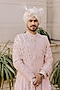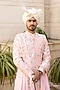Featuring a blush pink achkan sherwani in raw silk base with floral motifs, zardosi, resham, and dabka hand embroidery. It is paired with a kurta, a chanderi safa, a stole and pants. Style it with a pair of mojaris for a traditional look, perfect attire for your wedding, engagement or sangeet ceremony.