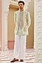 Featuring a mint green bandhgala jacket in pure bhagalpuri silk base with thread, sequins work, floral hand and machine embroidery. It is paired with a kurta and white trousers. Style it with shoes for a wedding, mehendi, sangeet or engagement ceremony, exuding charm and elegance.