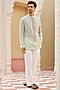 Featuring a mint green kurta in tokyo silk base with hand and machine embroidery. It is paired with pants. Style it with kolhapuri sandals for a festive occasion, mehendi, sangeet or engagement ceremony, exuding charm and elegance.