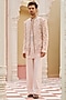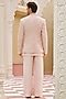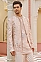 Featuring a pastel pink bandhgala jacket in pure bhagalpuri silk base with floral hand and machine embroidery. It is paired with a kurta and straight-cut trousers. Style it with kolhapuri sandals for a festive occasion, wedding, sangeet or engagement ceremony, exuding charm and elegance.