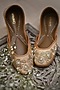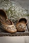 Featuring a pair of gold juttis in tissue brocade base with cutdana, pearls, and glass beads hand embroidery. It has a genuine leather underlining and 2mm inch heel.