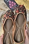 Featuring a pair of grey juttis in velvet base with floral print and sequins work. It has a leather lining and contrast olive green back.